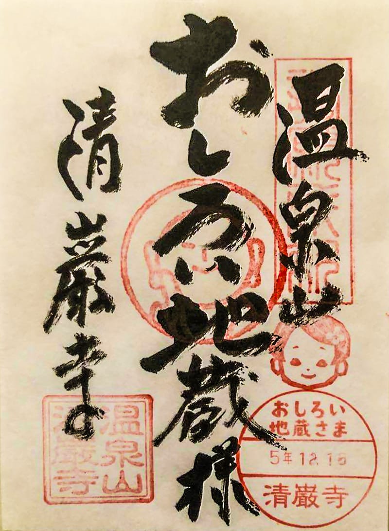 中央には、どうやら当該、おしろい地蔵さま のご尊容を彫り込んだ印判の押印、左端には「温泉山 清厳寺」と素敵に彫り込んだ角印の押印がある。