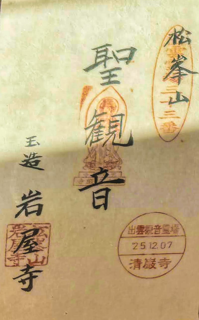 この御朱印は、出雲三十三観音 第三十三番札所に指定される境内の松峯山 岩屋寺にて奉斎される聖観世音菩薩の御朱印になる。