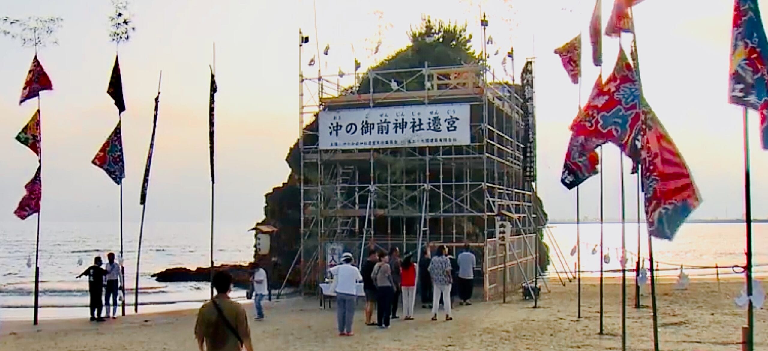 このような足場が設置された弁天島の姿も60年後にしか見れないことになる。