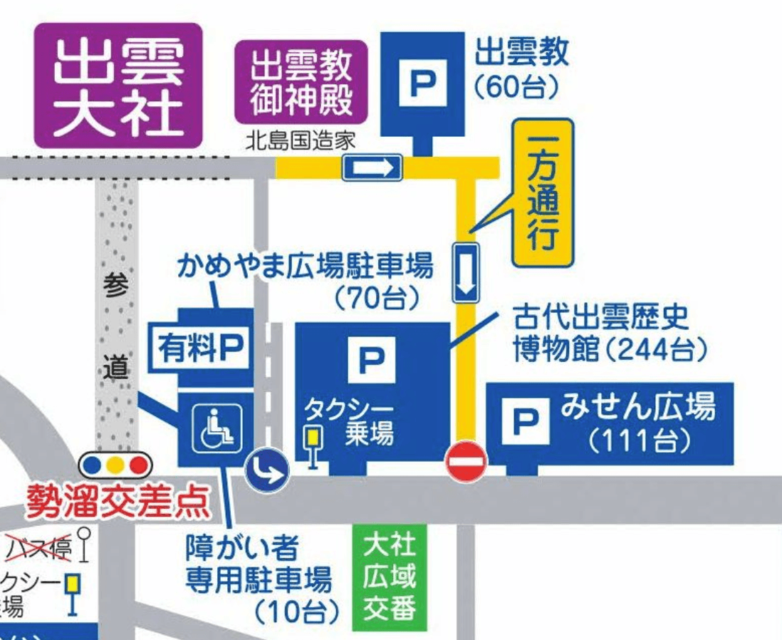 宮内交差点は大社小学校方面からの一方通行となり、稲佐の浜および、勢溜方面からの右左折は不可。また、大社の神楽殿方向からの直進も不可。