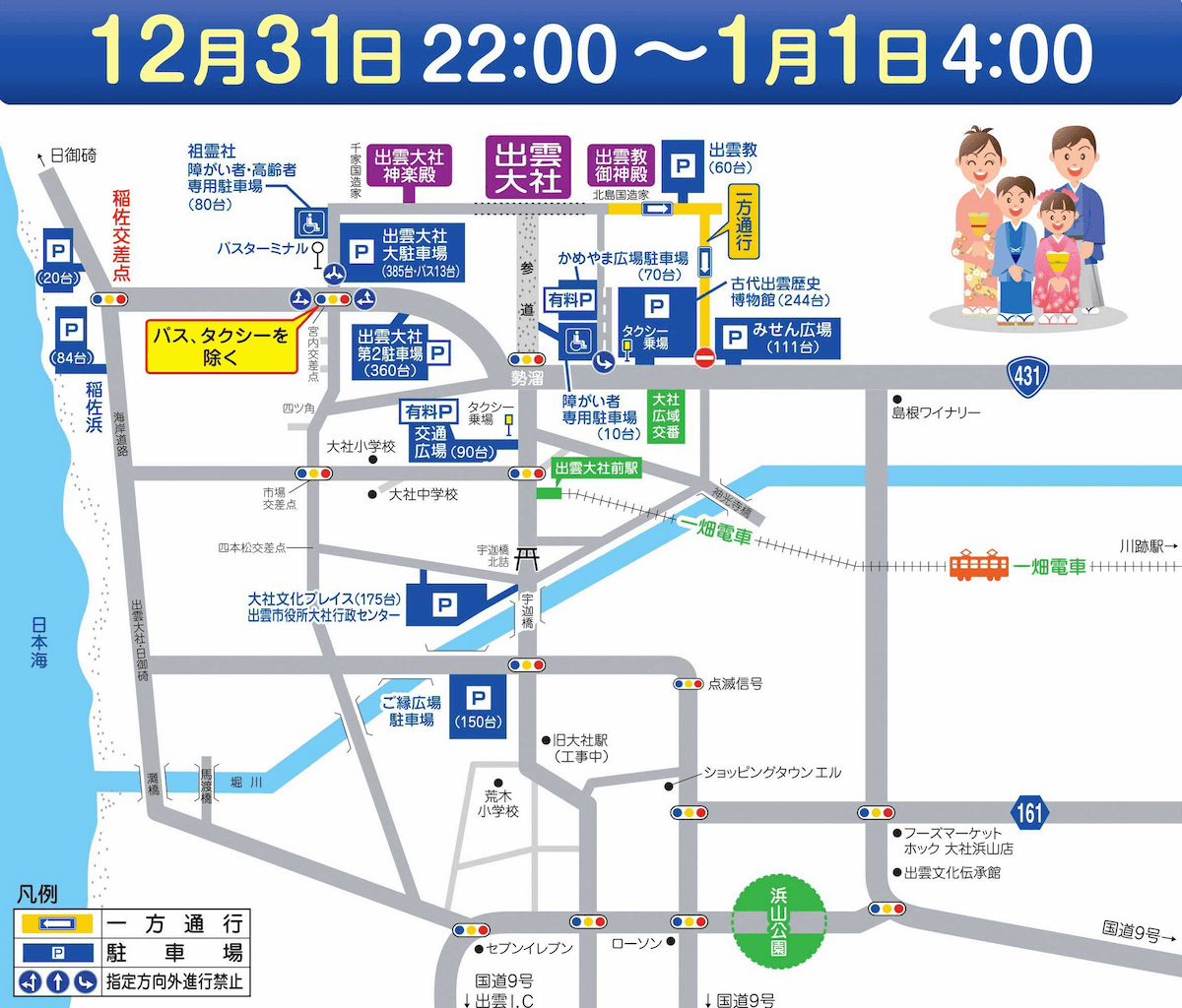 12月31日 22:00~1月1日 4:00までは、出雲大社東門前に位置する北島国造家(出雲教)前の狭路〜古代出雲歴史博物館角の交差点(みせん駐車場 角)まで出雲大社境内側からの一方通行規制。
